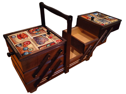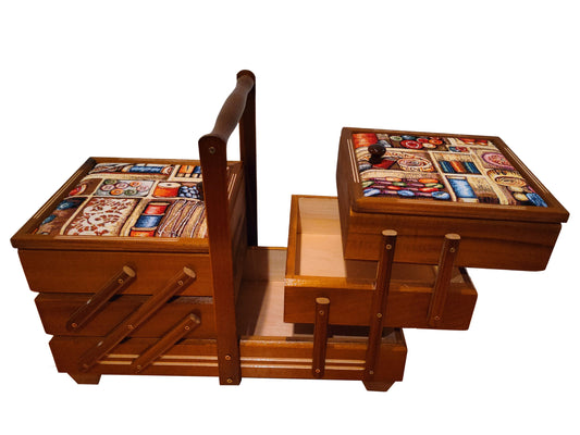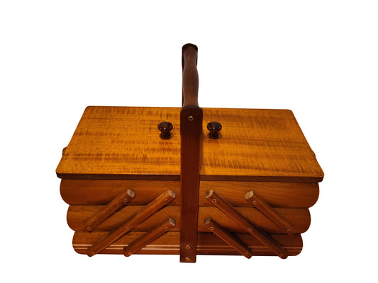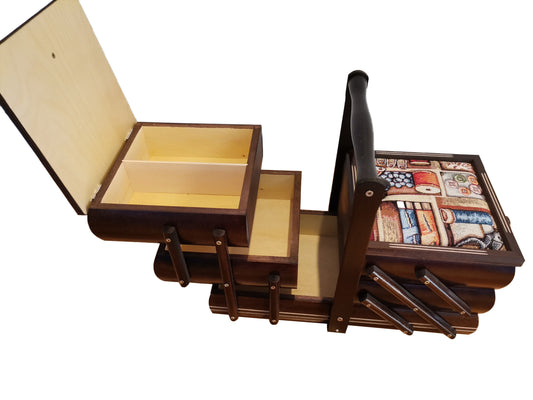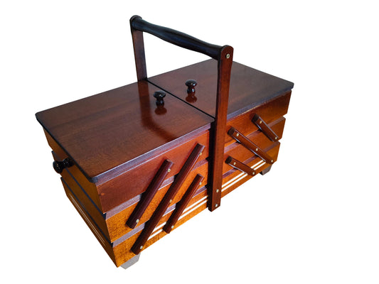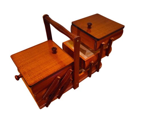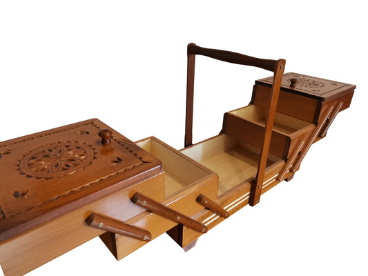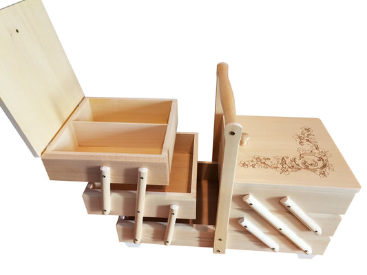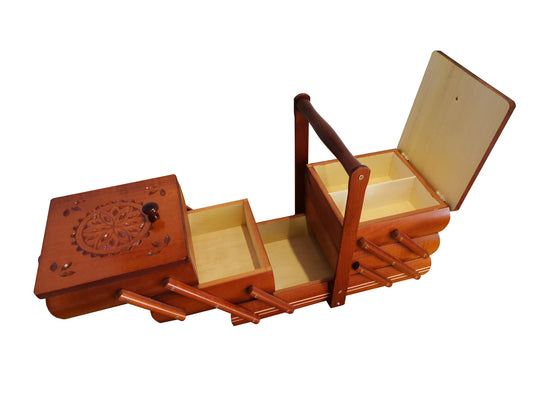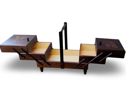 A beautifully crafted wooden sewing box, meticulously handmade with a touch of rustic charm. This wooden sewingbox is more than just a storage solution; it's a piece of art that celebrates the beauty of wooden items. Whether you're a seasoned seamstress or a beginner in the world of needle and thread, this sewing box is your companion in creativity.