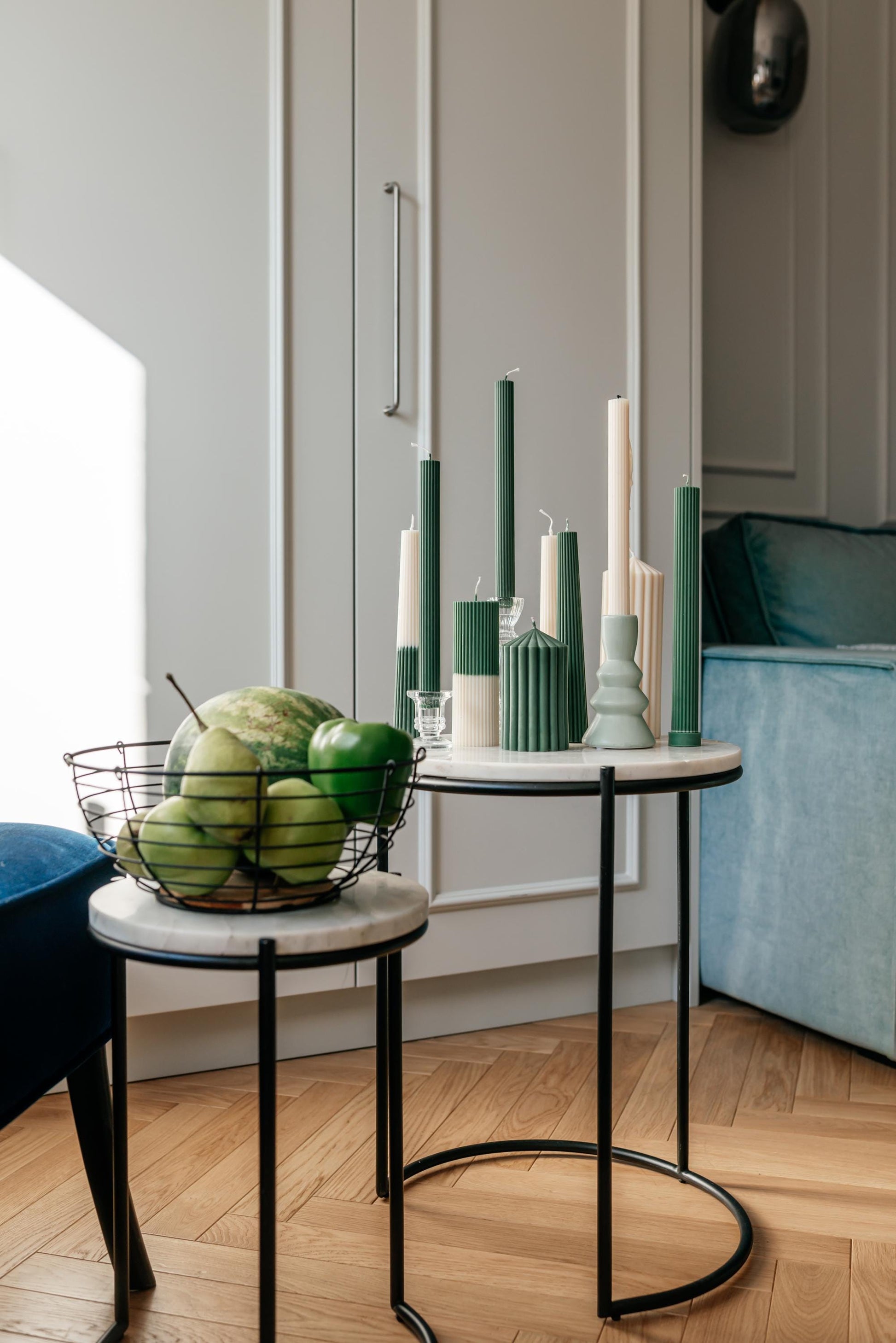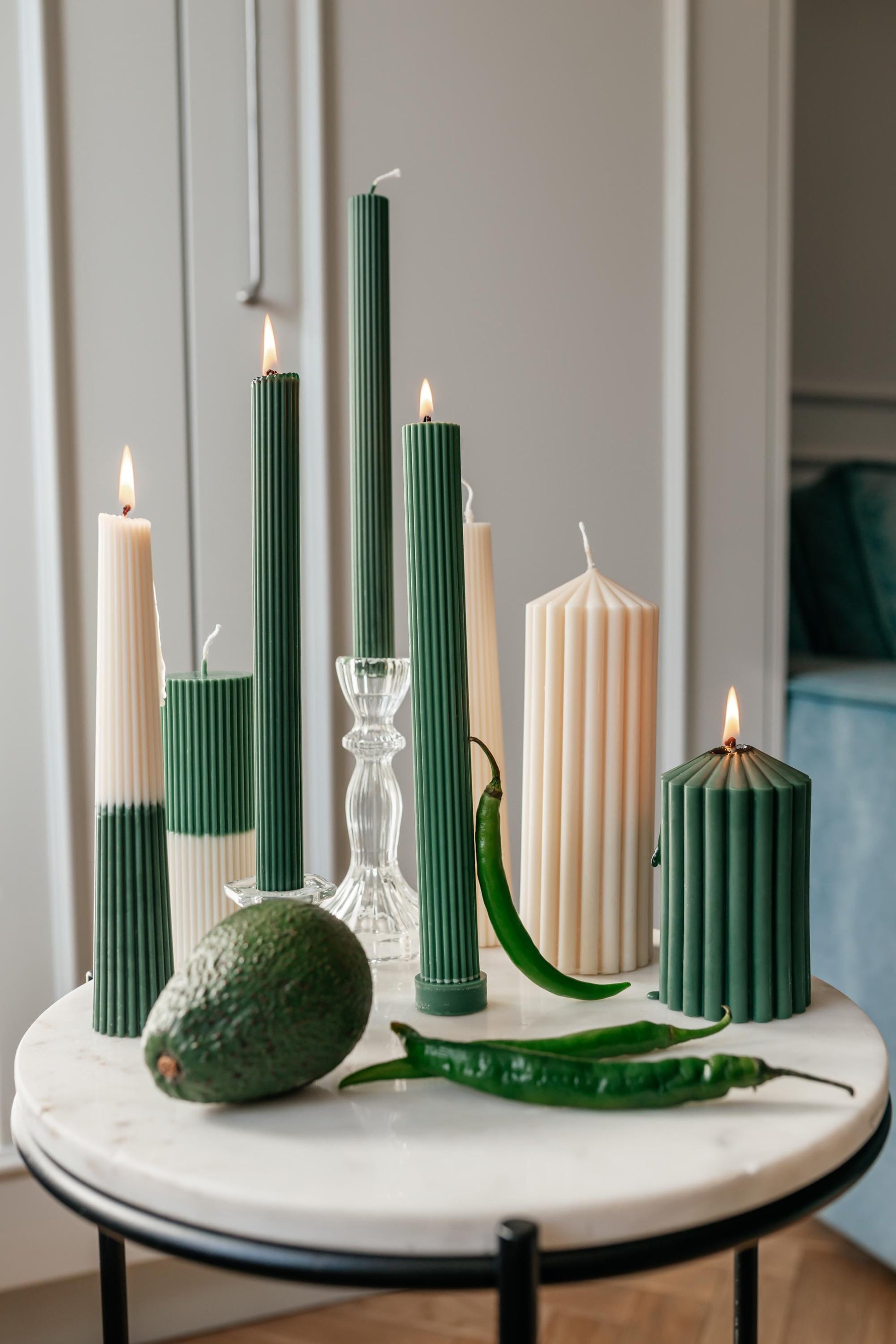 Each candle features a sleek ribbed texture and bold color-block design, combining creamy white with green candles for a timeless yet modern candle look. Whether you’re styling a cozy evening, adding navy blue decor to your home, or searching for an aesthetic candle for special occasions, these pieces are sure to impress.