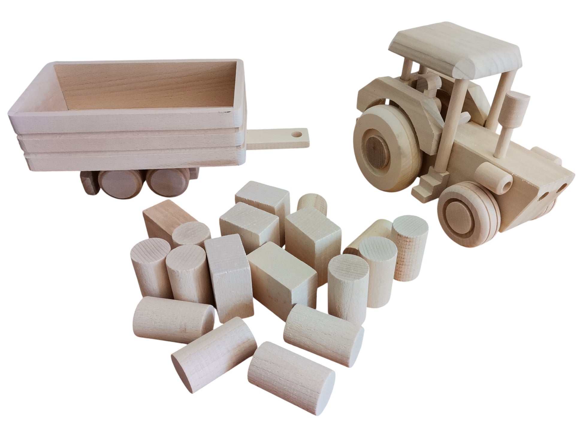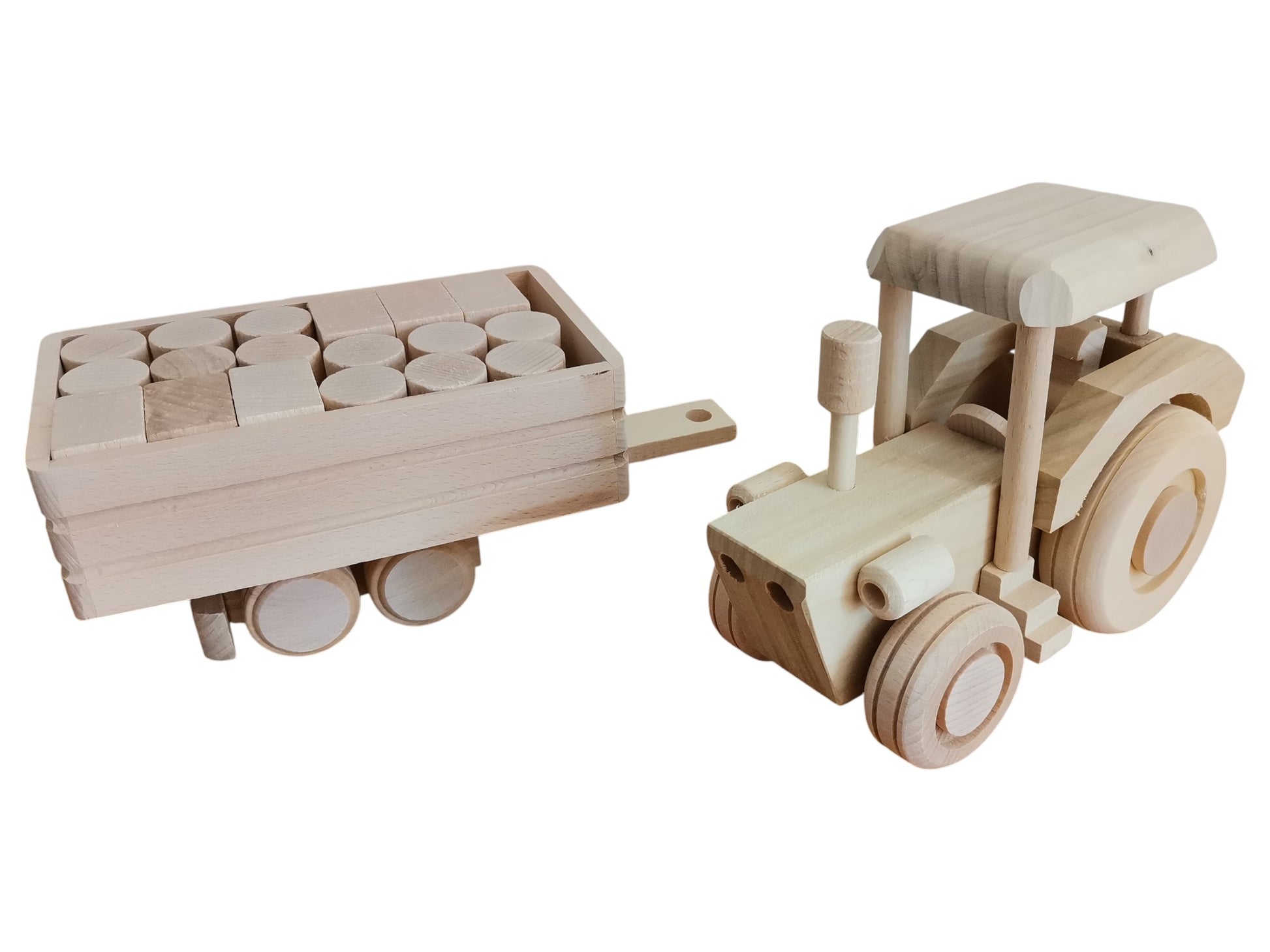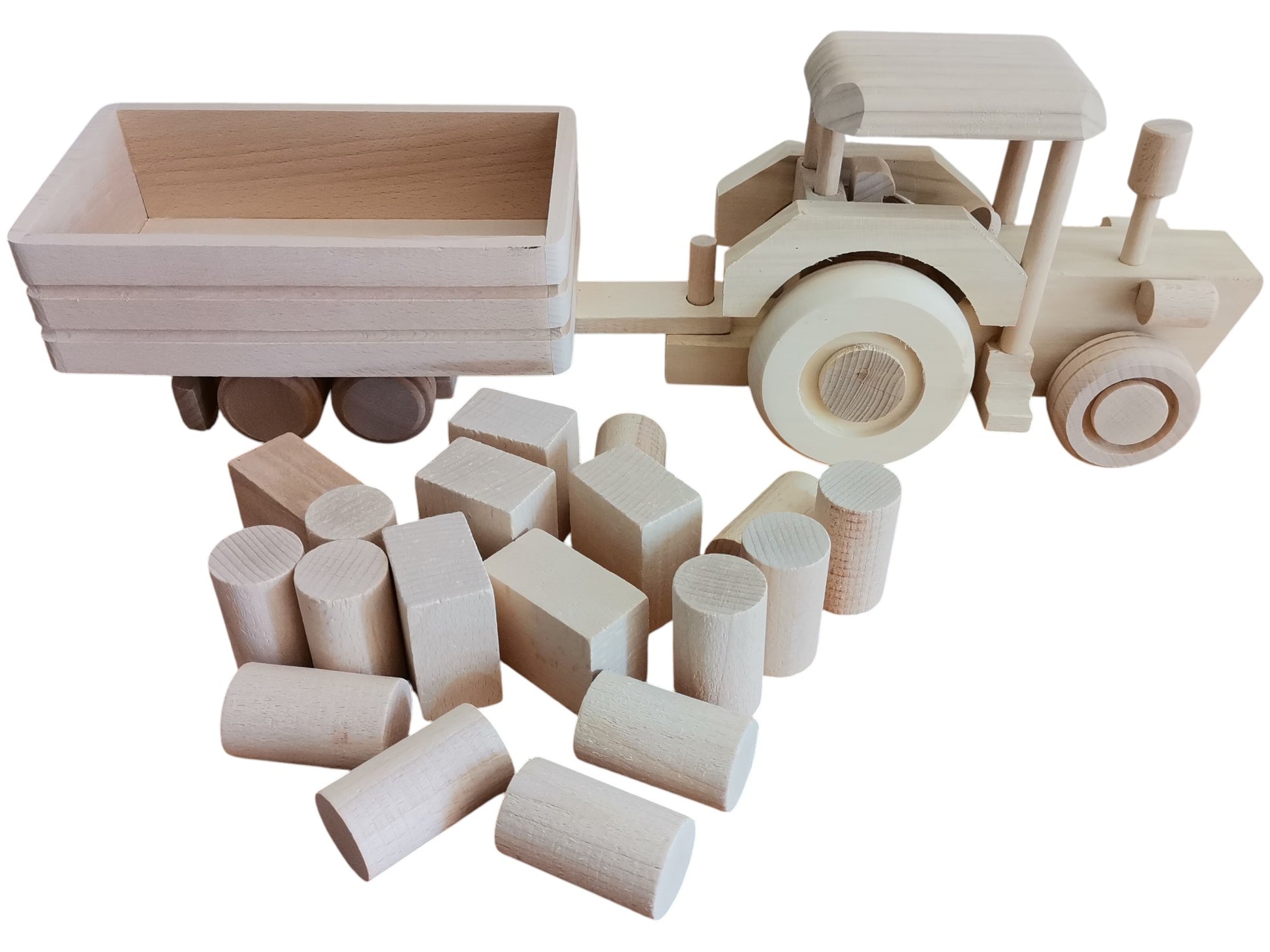 Tractor with trailer and 18 wooden blocks, big agrimotor, large traction-engine toy, raw wood toy for child, eco and safe, unpainted vehicle